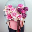 Коробка ярких роз и гортензии с хлопком
